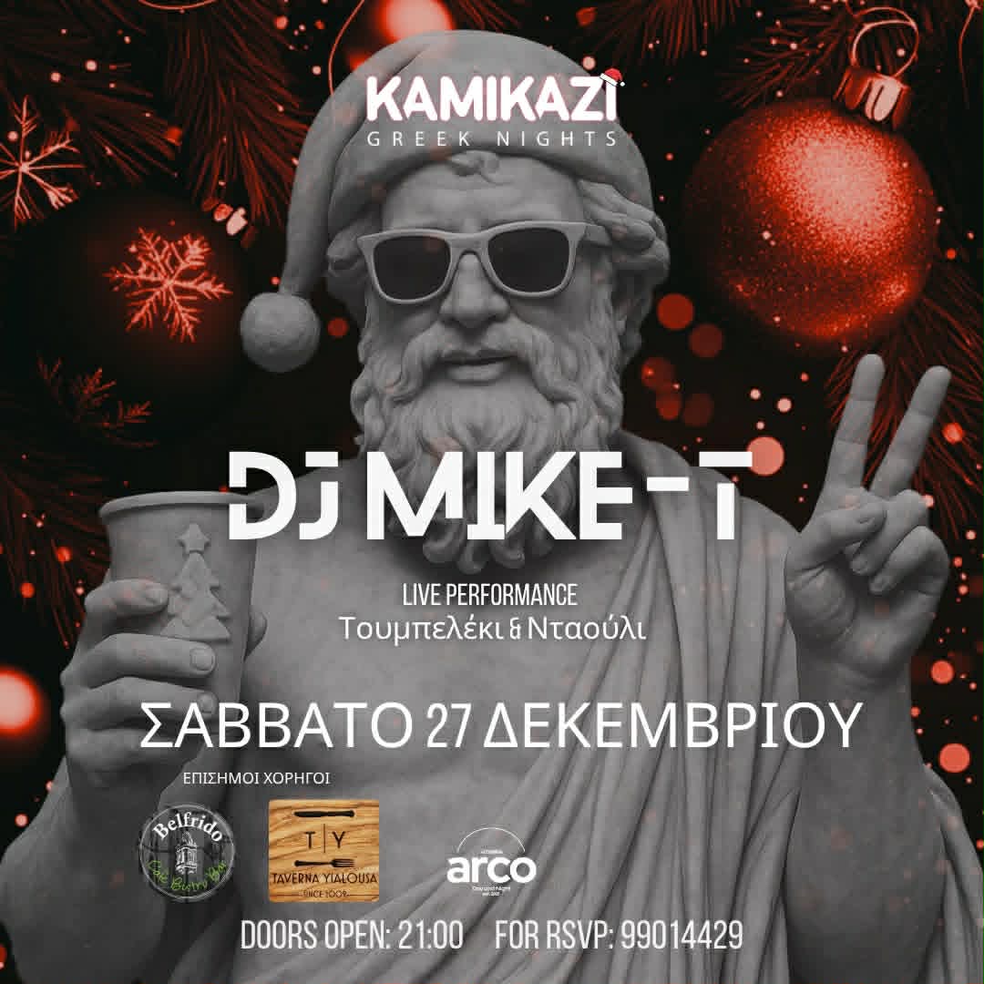 Ελληνικό πάρτι με τον DJ Mike-T, ζωντανά κρουστά (τουμπελέκι & νταούλι), χορό και ατελείωτο κέφι σε εορταστική ατμόσφαιρα.